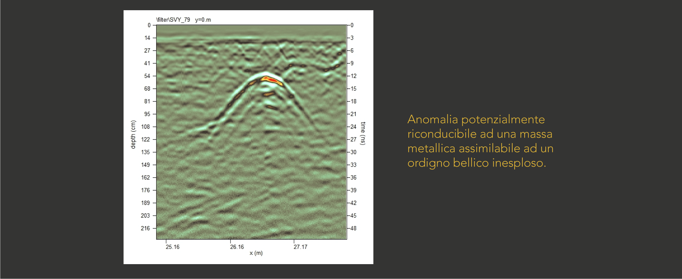 L’esecuzione di rilievi con metodologia G.P.R. è in grado di fornire una prima valutazione in merito alla presenza di masse metalliche potenzialmente riconducibili ad ordigni bellici inesplosi per la redazione del PSC in aree soggette ad attività di scavo. Oltre a ciò, essa può fornire ulteriori informazioni in merito a preesistenze quali sottoservizi, strutture sepolte di interesse archeologico e non, cisterne, serbatoi, locali, cavità, che potrebbero rivelarsi di intralcio durante la successiva opera di scavo.